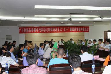7月2日下午,共青團(tuán)廣西區(qū)委、廣西青年聯(lián)合會、廣西學(xué)生聯(lián)合會和廣西區(qū)少工委在南寧召開座談會,認(rèn)真學(xué)習(xí)領(lǐng)會胡錦濤總書記在慶祝中國共產(chǎn)黨成立90周年大會上的重要講話精神,并圍繞進(jìn)一步為黨做好新形勢下的青年群眾工作進(jìn)行了交流討論。
