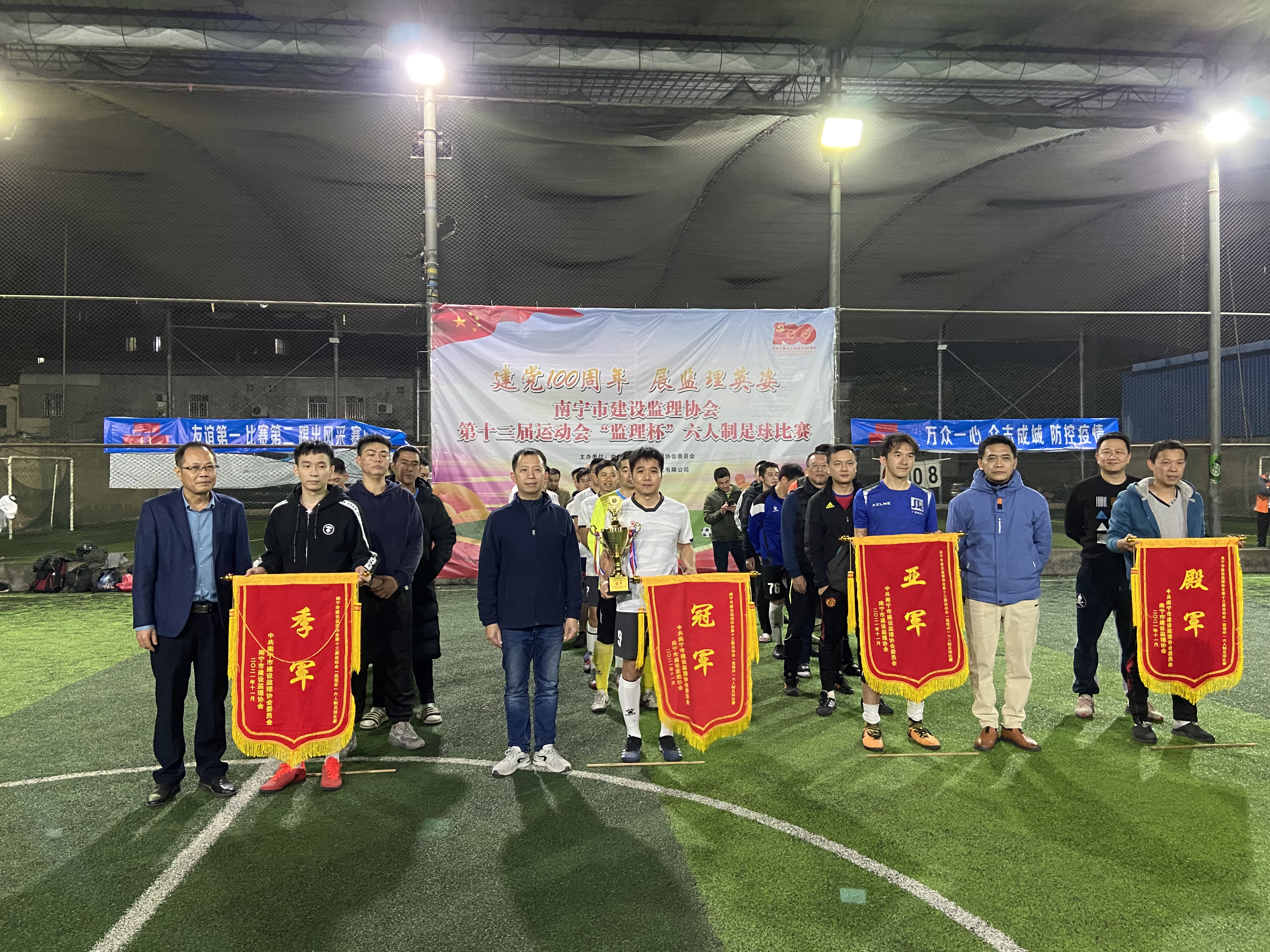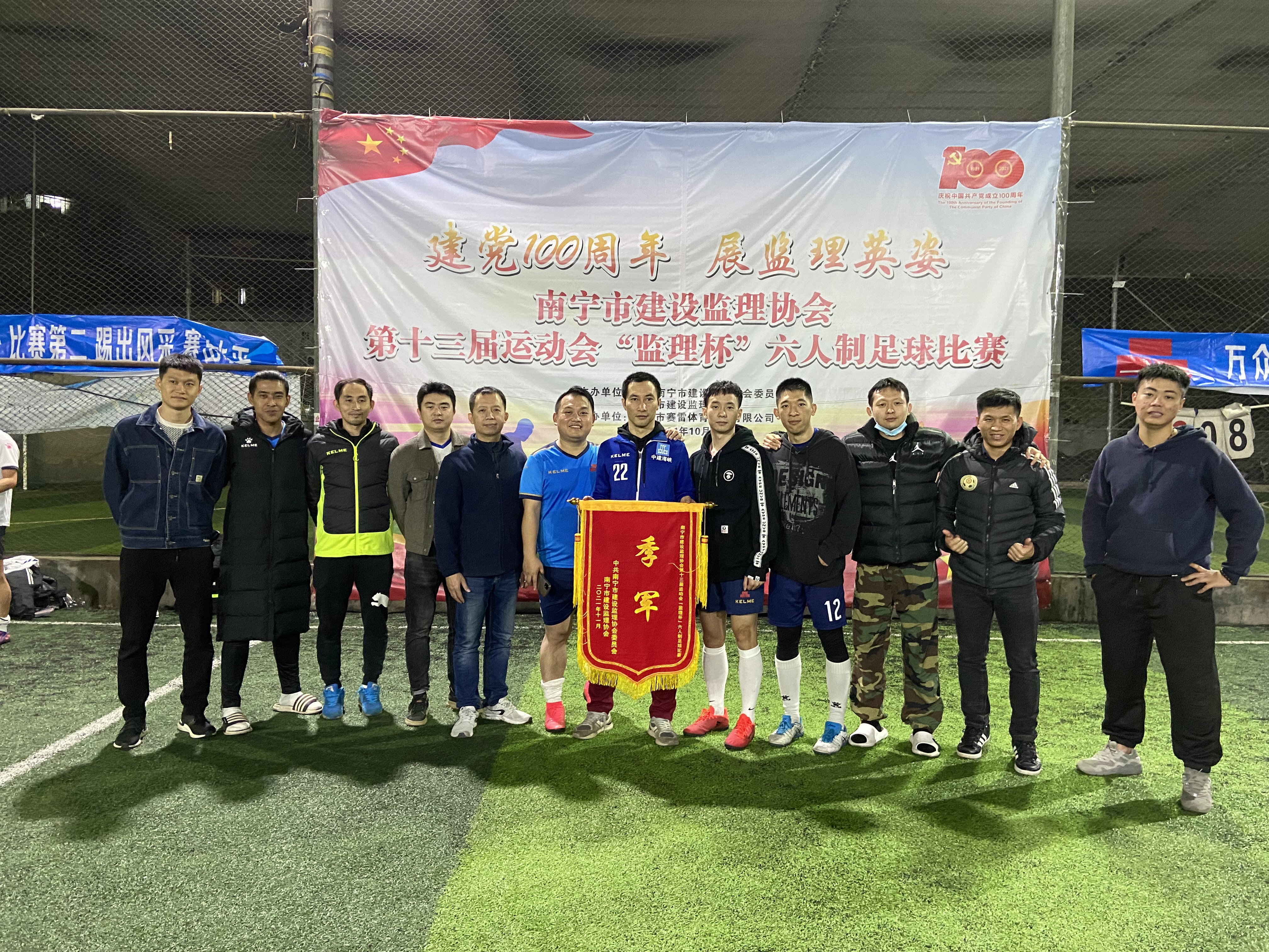 為慶祝中國共產(chǎn)黨建黨100周年,中共南寧市建設監(jiān)理協(xié)會委員會和南寧市建設監(jiān)理協(xié)會共同舉辦了南寧市建設監(jiān)理協(xié)會第十三屆運動會“監(jiān)理杯”六人制足球比賽,經(jīng)過兩個多月緊張、激烈的比賽,于2021年12月23日23:00完美落幕,南寧品正足球隊在此次比賽中榮獲季軍。