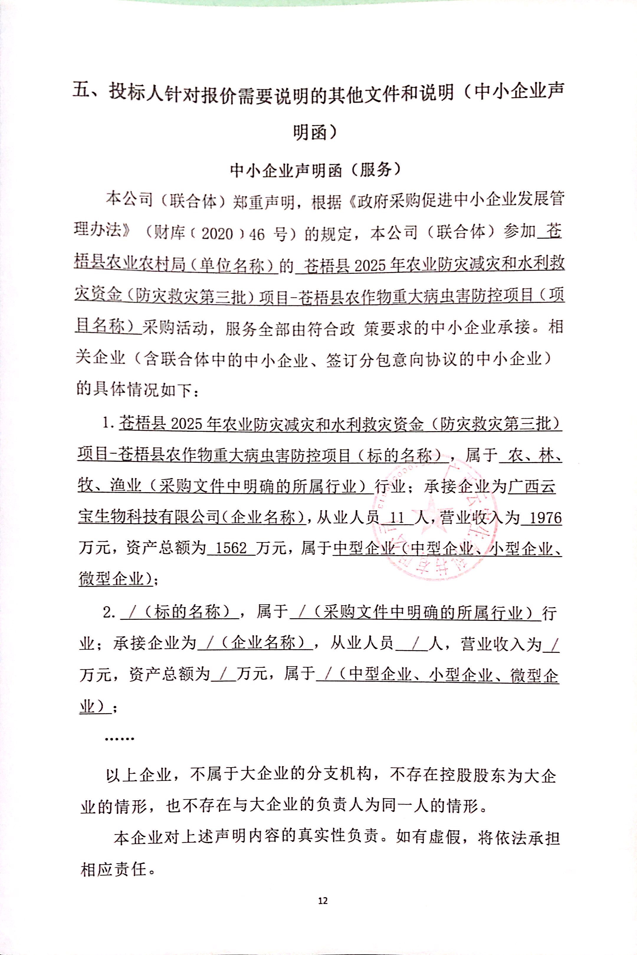 1 | 蒼梧縣2025年農(nóng)業(yè)防災(zāi)減災(zāi)和水利救災(zāi)資金(防災(zāi)救災(zāi)第三批)項(xiàng)目-蒼梧縣農(nóng)作物重大病蟲害防控項(xiàng)目 | 詳見競(jìng)爭(zhēng)性談判文件和響應(yīng)文件內(nèi)容。 | 合同簽訂后 5 個(gè)工作日內(nèi)供貨,并在 20 個(gè)工作日內(nèi)完成項(xiàng)目?jī)?nèi)容 | 1.國(guó)家強(qiáng)制性標(biāo)準(zhǔn)及有關(guān)規(guī)定。 2.競(jìng)爭(zhēng)性談判采購(gòu)文件的采購(gòu)需求及成交供應(yīng)商響應(yīng)文件響應(yīng)的事項(xiàng)。 3.為確保貨物質(zhì)量避免假冒偽劣產(chǎn)品,供應(yīng)商必須在供貨時(shí)提供生產(chǎn)廠家針對(duì)此項(xiàng)目的售后服務(wù)保證函原件、供貨證明原件并加蓋生產(chǎn)廠家公章。 4.按以上列明需要提供證書、截圖、文件等資料一并提交我方后才可確認(rèn)驗(yàn)收,不提供或提交不全的不予確認(rèn)。 |