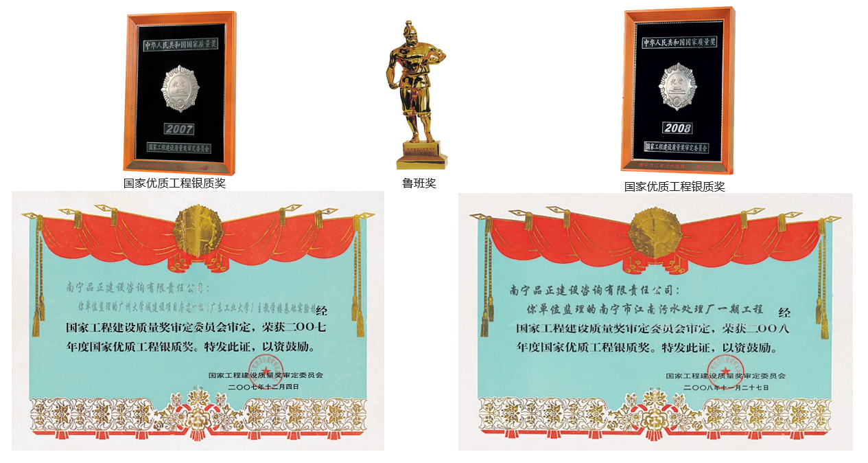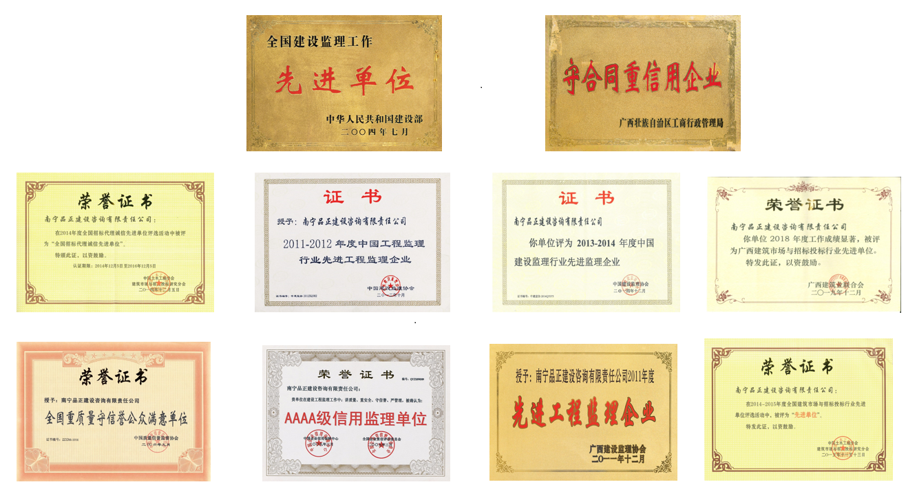 經(jīng)過(guò)十幾年的錘煉,積淀了“南寧品正”獨(dú)具特色的企業(yè)文化,成功地締造了“南寧品正”品牌。南寧品正是“全國(guó)工程監(jiān)理先進(jìn)單位”、“全國(guó)監(jiān)理行業(yè)安全管理先進(jìn)單位”、“全國(guó)重質(zhì)量守信譽(yù)公眾滿意單位”、“全國(guó)AAAA級(jí)資信示范監(jiān)理單位”、“廣西誠(chéng)信企業(yè)”、“廣西守合同重信用企業(yè)”。在廣西建設(shè)監(jiān)理協(xié)會(huì)和南寧市建設(shè)監(jiān)理協(xié)會(huì)組織的歷次評(píng)選中,均被評(píng)為“廣西先進(jìn)工程監(jiān)理企業(yè)”、“南寧市先進(jìn)監(jiān)理單位”,連續(xù)多年被評(píng)為南寧市城鄉(xiāng)建設(shè)系統(tǒng)“先進(jìn)單位”、“先進(jìn)基層黨組織”、“宣傳工作先進(jìn)單位”,并被評(píng)為“南寧市先進(jìn)單位”。公司所承擔(dān)監(jiān)理和實(shí)施項(xiàng)目管理的工程項(xiàng)目共獲得數(shù)十項(xiàng)國(guó)家、省部級(jí)、自治區(qū)和市級(jí)獎(jiǎng)項(xiàng)。